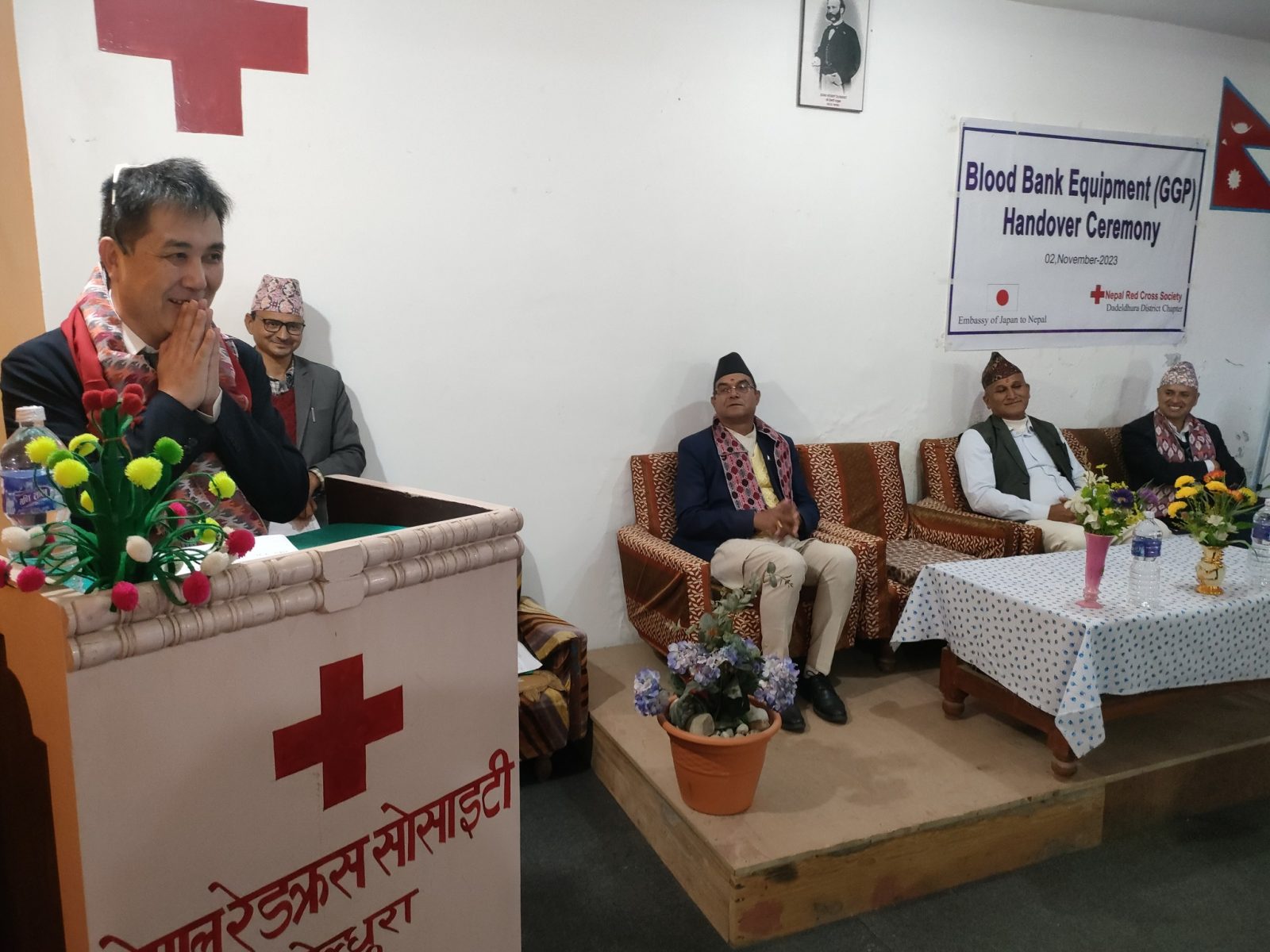The handover ceremony of the equipment supported by the Government of Japan to the Blood Bank of Nepal Red Cross Society (NRCS) Dadeldhura District Chapter in Amargadhi Municipality was held on 2 November 2023. Mr. TAMURA Takahiro, the Deputy Chief of Mission of the Embassy of Japan in Nepal, attended the ceremony.