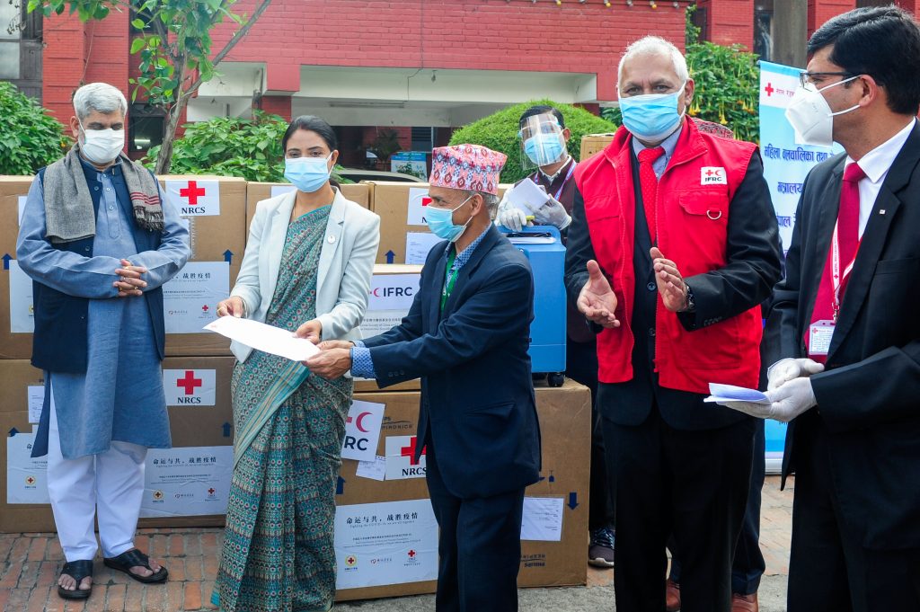 Nepal Red Cross Society (NRCS) handed over 90 Oxygen concentrators and  700,000 masks, 2,000 coveralls to The Ministry of Health and Population. The health equipment were received from the Red Cross Society of China in coordination with the IFRC CO Nepal. The handover programme was facilitated and coordinated by the Ministry of Women, Children and Senior Citizens. NRCS Chairperson Dr. Netra Prasad Timsina handover Handover Note to Honorable Minister Juli Kumari Mahato, Minister of the Ministry of Women, Children and Senior Citizens, to Honorable Minister Hridayesh Tripathi, the Ministry of Health and Population.